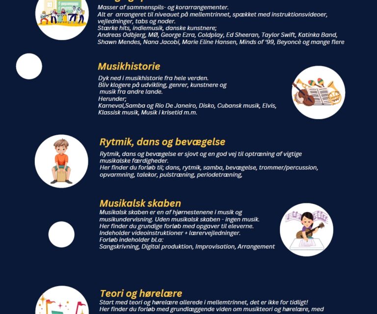 Vi er praktikere og undervisere, og har udviklet materialer til musikfaget siden 2013. Du finder mere end 250 forløb, aktiviteter og arrangementer + et hav af audio øvetracks og instruktionsvideoer på portalen, samt en hurtigt voksende sangbank. Alle materialer er udviklet og testet af forfatterne selv i et musiklokale.