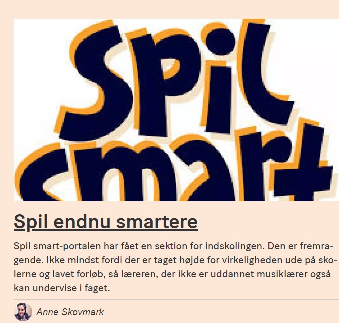 Spil smart-portalen har fået en sektion for indskolingen. Den er fremragende. Ikke mindst fordi der er taget højde for virkeligheden ude på skolerne og lavet forløb, så læreren, der ikke er uddannet musiklærer også kan undervise i faget.
